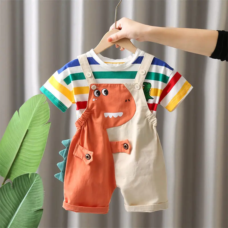 Dress your little one in fun and comfort with this adorable boys summer clothing set featuring a playful cartoon dinosaur design. Made from soft and breathable fabric, it keeps kids cool and comfortable during warm weather. The set includes a short sleeve T-shirt and matching bib pants for a coordinated and stylish look. Bright rainbow details and cute prints add a cheerful touch that kids will love. The lightweight material allows easy movement, making it perfect for active play and daily adventures. Designed with comfort in mind, it is gentle on delicate skin for all-day wear. The relaxed fit ensures freedom of movement while playing or exploring. Easy to put on and take off, it is practical for busy parents. Durable stitching ensures long-lasting use even after frequent washing. This fun and colorful outfit is a great choice for everyday wear, outings, or as a cute gift for toddlers.